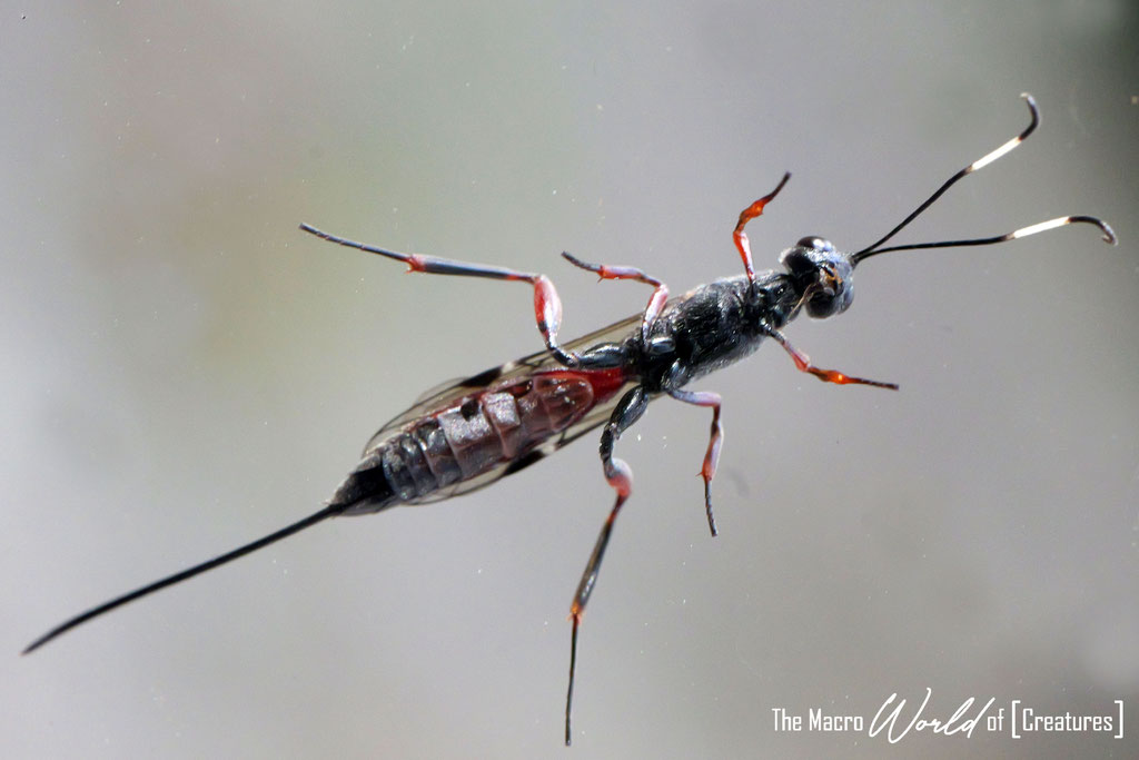Die ♀ dieser Kreatur haben am Ende des Hinterleibs einen kleinen weißen Abschnitt und anschließend einen langen schwarzen Legestachel. Ihre Fühler sind schwarz mit einem breiten weißen Ring. Die ♂ ähneln den ♀, aber es fehlen der Legestachel und der weiße Abschnitt am Hinterleib, sowie der weiße Ring auf den Fühlern.