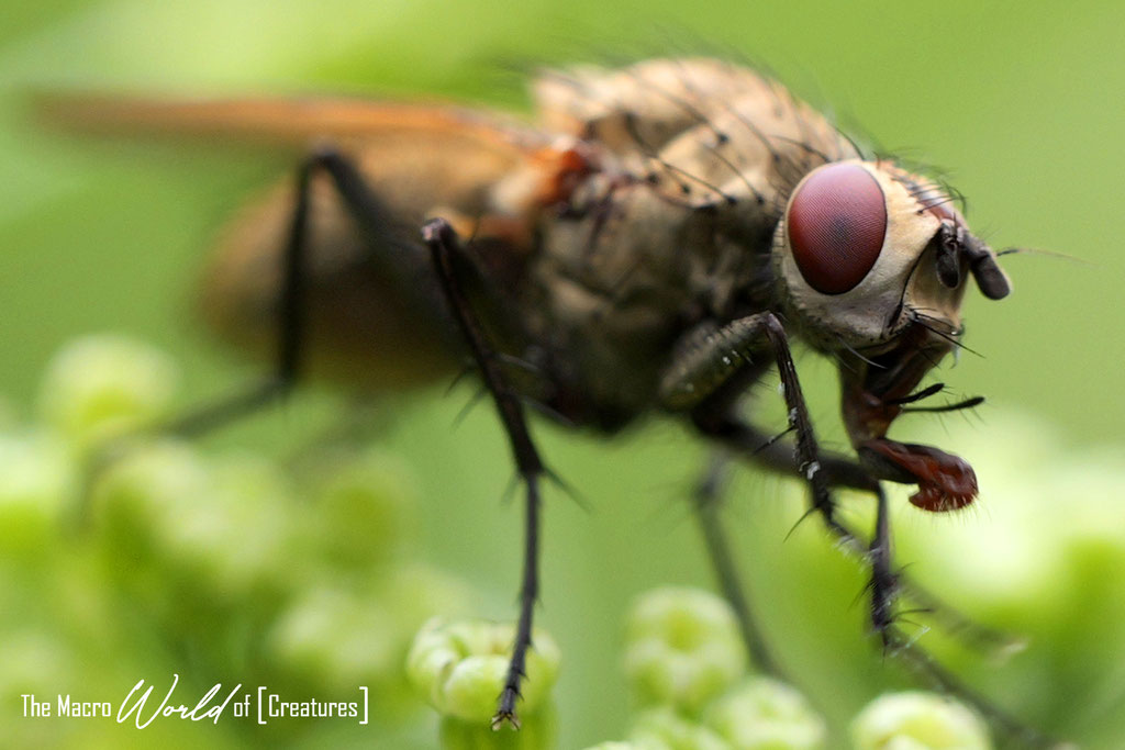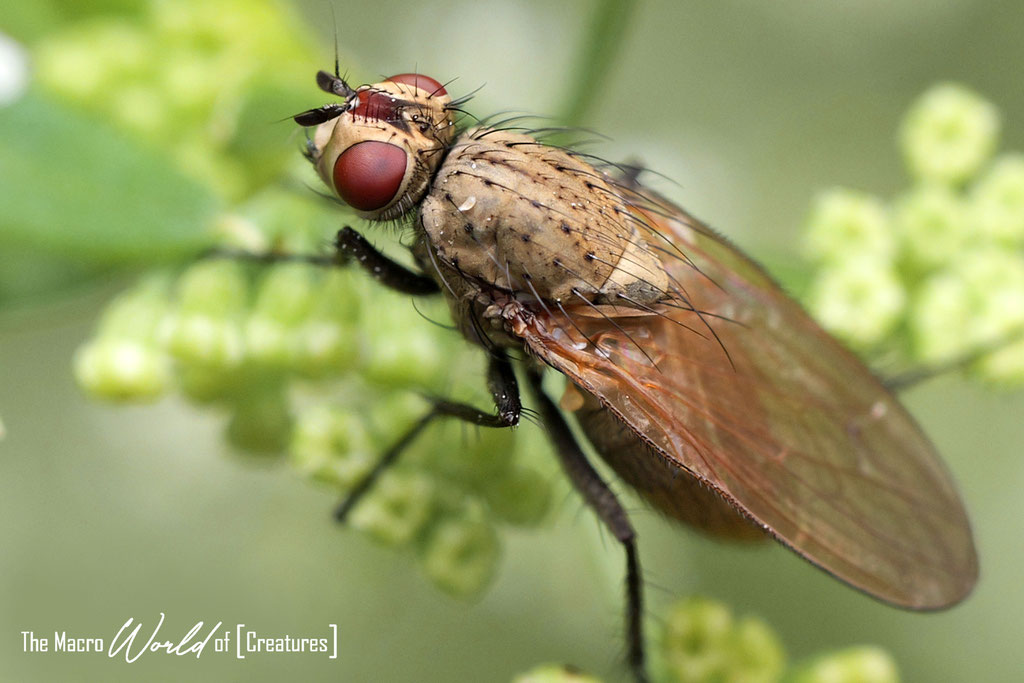Die blassorangefarbene Kreatur ist mit ausgeprägten dunklen Borsten augestattet. Die Stirn ist orange, die Tarsen dunkel. Die Augen der ♂ stoßen, wie typisch bei Fliegen, zusammen (holoptisch), bei den ♀ sind die Augen durch die Stirn getrennt und der Kopf ist breiter. Der Hinterleib der ♂ ist kurz und deutlich schmaler als bei den ♀.