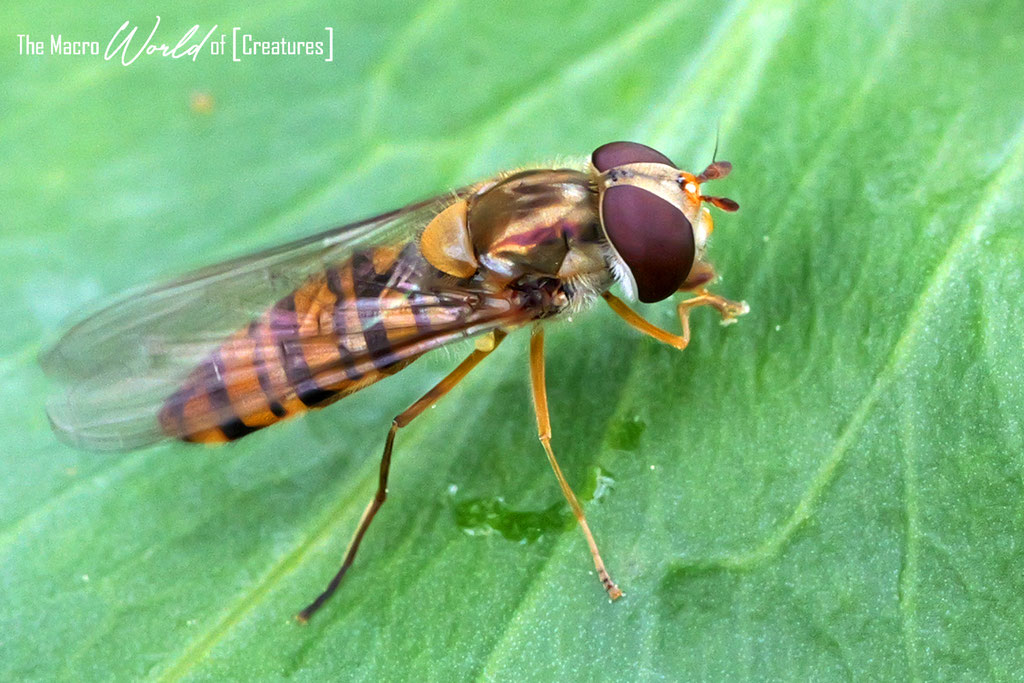 Diese recht große Schwebfliege ist oft schwierig zu fotografieren, da sie meist unruhig auf Blättern umher huscht - scheinbar immer auf der Suche nach Blütenstaub (Das kann ich bestätigen...daher ist kein Bild richtig scharf). Diese Kreatur ist die häufigste Art der Gattung und ist meist an sonnigen Stellen auf den Blättern von Büschen und Sträuchern zu finden. Sie fressen Pollenkörner, die auf die Blätter gefallen sind (siehe Bild) und Pollenkörner aus den Kot anderer Schwebfliegen.