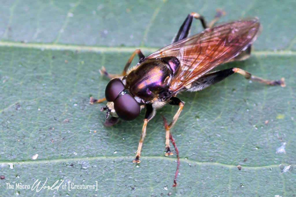 Das Gesicht und die Beine dieser Kreatur sind gelb. Bei den ♂ stoßen die großen Augen an der Stirn zusammen. Bei den ♀ sind die Augen durch die Stirn klar voneinander getrennt. Das dunkelgrünlich schimmernde Rückenschild trägt drei hellgraue Längslinien. Am Hinterleib befinden sich am zweiten Segment zwei gelbe Flecken, am dritten und vierten Segment breite, schwarze Hinterrandsäume und mittig „schnurrbartähnliche“ Linien. Durch ist die Art gut von anderen Arten zu unterscheiden. Die schwarzen Seitenränder des Hinterleibs sind seitlich nach unten geschlagen und von oben gesehen nicht sichtbar. Auffallend ist vor allem die Mimikry zur wehrhaften Wespe.
