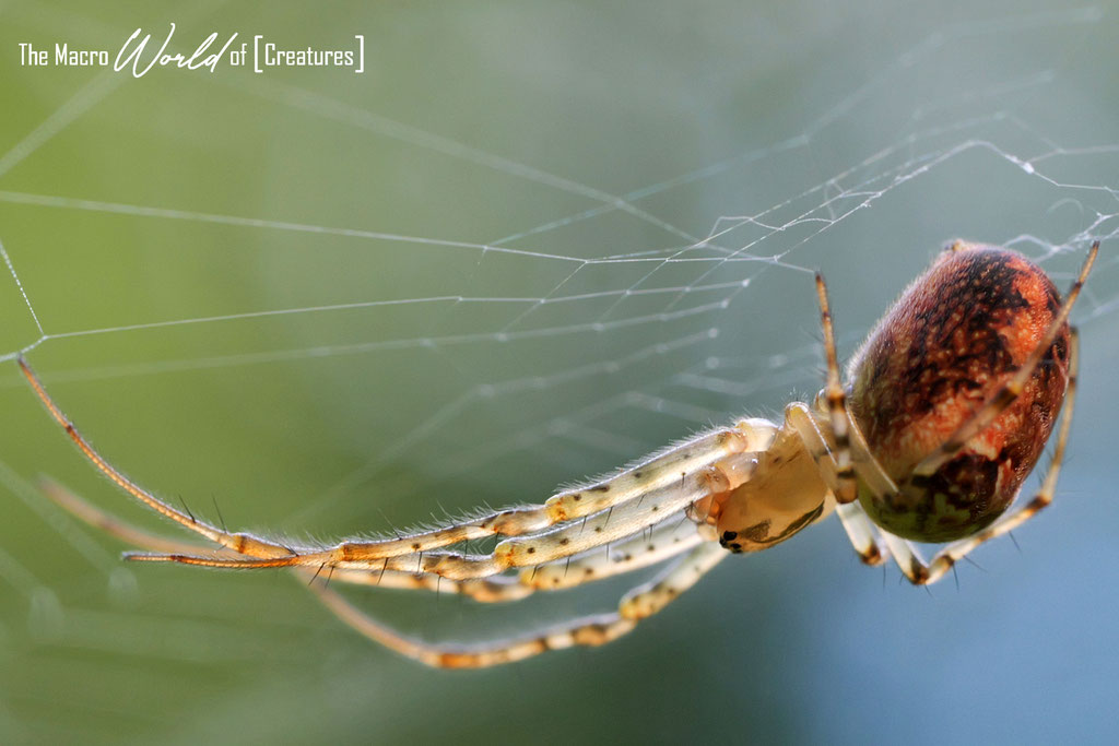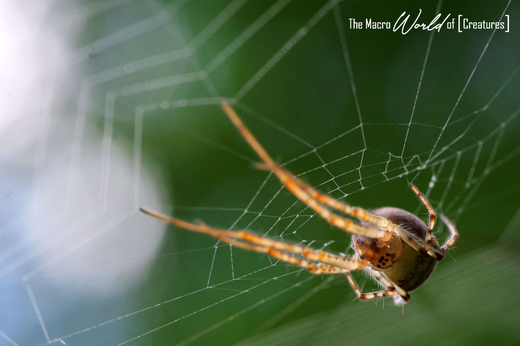 Diese Kreatur baut in der Regel ein bodennahes Radnetz in der niedrigen Vegetation. Die sehr feinmaschigen, kleinen Netze besitzen etwa 60 Radien und 50 - 60 Umgänge. Die Spinne ist gewöhnlich an der Unterseite der Nabe ihres meist stark geneigten, fast waagerechten Fangnetzes zu finden. Bei uns versteckt sie sich allerdings auf einem Blatt der Pimpinelle neben ihrem Netz.