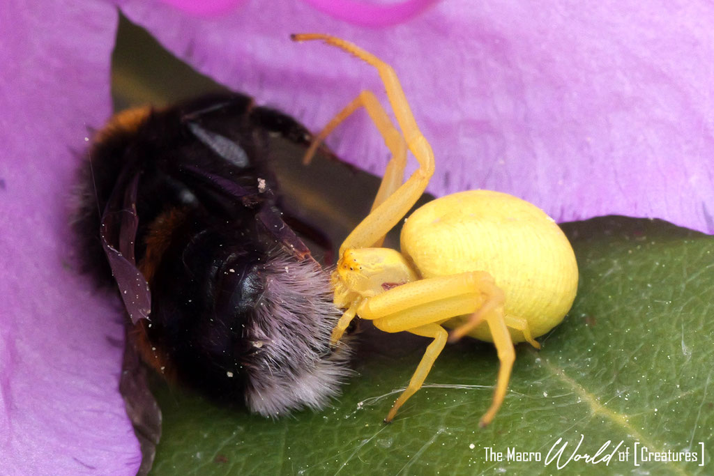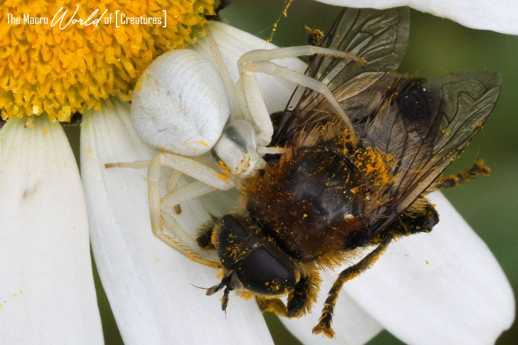 Diese Kreatur findet man meist auf oder an Blüten auf Beute lauernd vor. Sie kann ihre Färbung innerhalb weniger Stunden in einem gewissen Grade ihrer Umgebung anpassen, wenn auch meist nicht so kontrastreich. Als Farben kommen weiß, gelb oder leicht grünlich in Betracht. Von daher bevorzugt sie auch Blüten mit solchen Farben. Sie kann auch große, wehrhafte Insekten wie Bienen (Foto 2 und 3) überwältigen. Ihre Schnelligkeit bei der Überwältigung der Beutetiere und ein schnell wirkendes Gift machen es möglich.