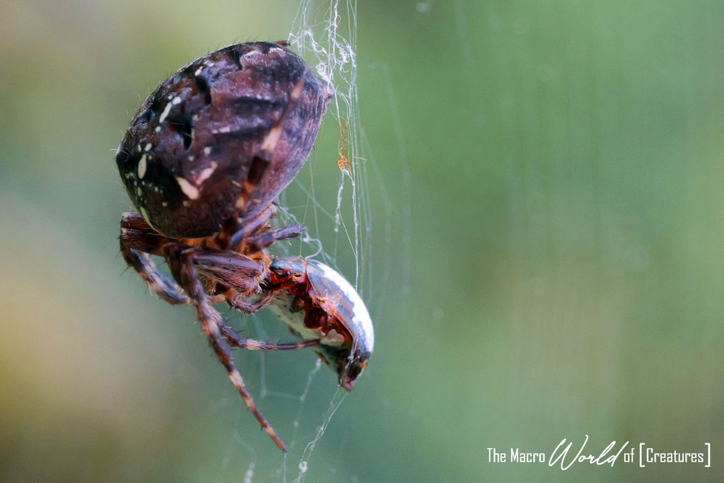 Beutetiere bereits vorverdaut. Hier verzichtet das ♀︎ auf das Einspinnen der Beute zu einem Vorratspaket... das Fliege wird hier direkt verdaut!