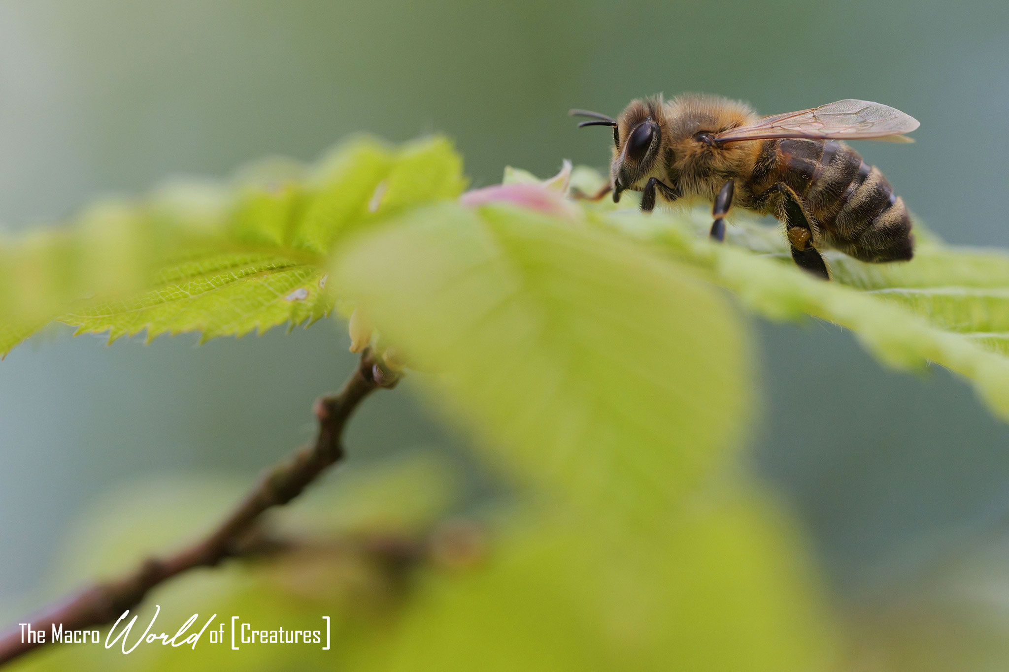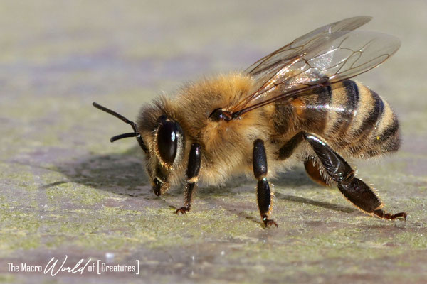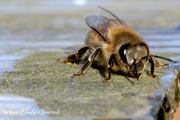 Heute ist der Bachlauf wieder ein hochfrequentiertes Spaßbad und eine Bar für durstige Tiere aller Art. Hier baden die Vögel neben trinkenden Insekten. Insbesondere die Mädels machen hier zwischen ihren Sammelflügen immer wieder kurze Pausen. Bei dieser Kreatur ist die rote Zunge deutlich zu sehen.