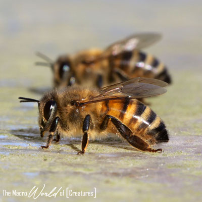 Diese Kreatur stillt aber nicht nur ihren eigenen Durst, sondern bringt einen Teil des Wassers auch in den Stock. So können auch die Stockbienen ihren Durst löschen. Ist es zu warm im Stock wird das Wasser auf den Waben verteilt und mit Flügelschlägen für Durchzug gesorgt. Die Verdunstung des Wassers senkt die Temperatur im Bienenstock. Ist es richtig heiss, produzieren Bienenvölker fast keinen Honig mehr und sind nur noch mit Wasserholen und Kühlen beschäftigt.